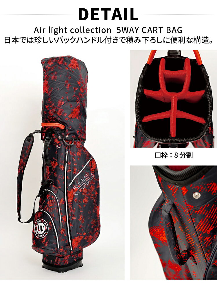【商品データ】 メーカー品番:ALT9CT-25/ALT9CT-27/ALT9CT-28/ALT9CT-29 ブランド:OUUL /オウル 商品名: Air light collection/5WAY CART BAG/カートキャディバッグ 素材:ナイロン サイズ:8.5型 口枠:8分割 重量:1.9kg 長さ対応:47インチ カラータイプ: ●Black/Lava(ALT9CT-25)レッド ●Black/Sapphire(ALT9CT-27)ブルー ●Black/Tonal(ALT9CT-28)ブラック ●Black/T-matrix/Gray(ALT9CT-29)グレー 付属品:純正フード 【その他】 ※純正フードは折り目など付きにくいよう取り扱いには気をつけておりますが、素材の特性上若干のシワはご容赦下さいませ。